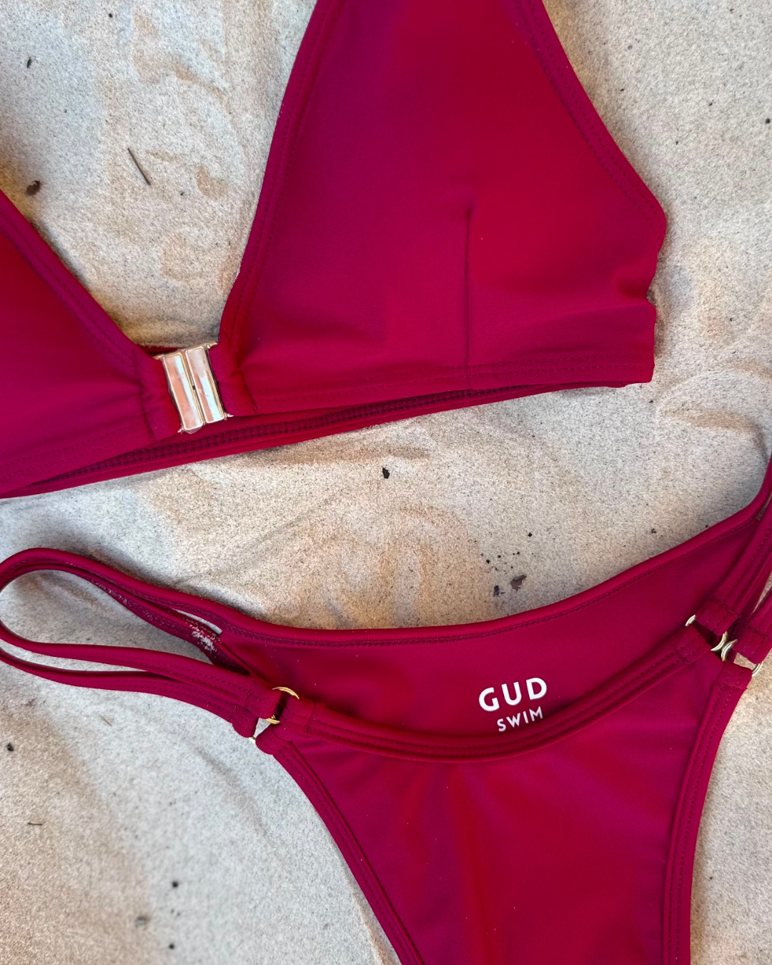 The Mae Clip Front Bikini Top in Cherry, is a supportive red bikini top designed to flatter a wide range of bust sizes while remaining comfortable enough for all-day wear. Featuring a clever bust dart that accommodates both smaller and larger busts, this bikini top is especially well suited to those with a smaller underbust and fuller bust, creating a naturally lifted shape without feeling restrictive. Finished with a luxe gold clip-front clasp and twin needle stitching for added security, Mae is designed for effortless confidence whether you’re poolside or at the beach. Removable cup padding allows for adjustable coverage and a personalised fit.